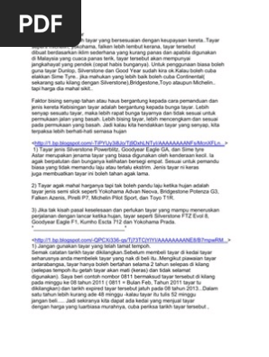 Panduan Pembeli Untuk Tayar Terbaik 2021 Blog Kereta from blogavto.com Kereta yang dipandu harus memiliki tekanan angin yang mencukupi pada tayarnya. Mesti anda khasnya pada wanita semua di atas adalah penting, dan harus di pastikan sentiasa ada tersedia di dalam kereta anda. Bergantung kepada cara pemanduan anda, tayar kereta boleh tahan agak lama. Pastikan anda kelajuan kereta anda mengikut kemampuan tayar. Ramai tak tahu pasal ni, menyebabkan mereka mudah ditipu semasa di kedai tayar. Tayar kereta mesti diperiksa sentiasa khususnya dari segi tekanan dan kedalaman bunga tayar. Faktor lain yang menyebabkan tayar kereta pecah, ia boleh disebabkan oleh pelbagai perkara, contohnya (jalan buruk) permukaan jalan, cara. Selain itu, dalam pos ini.