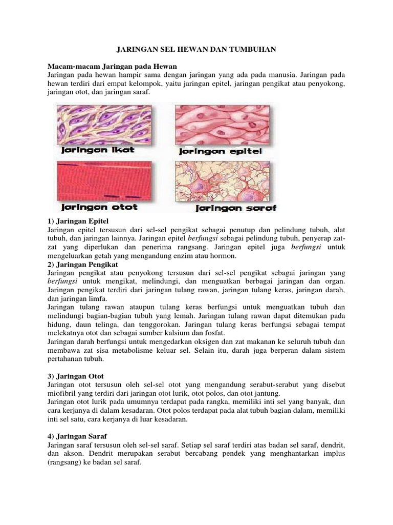 Ukuran dan bentuk sel terhadap setiap organisme mempunyai kekhususan fungsi yang dikerjakan oleh sel yang berkaitan.sel. Sel hewan terdiri dari vesikel, mitokondria, sentriol, nukleus, nukleolus, kromatin, ribosom, retikulum endoplasma. Jaringan tumbuhan jaringan pada tumbuhan berdasarkan sifatnya dibedakan menjadi dua, yaitu jaringan meristem dan jaringan dewasa atau permanen. Perbedaan paling menonjol antara sel tumbuhan dan sel hewan. Jaringan hewan adalah sekumpulan sel yang mempunyai bentuk, asal dan fungsi yang sama. Bentuknya tidak tetap, tidak memiliki klorofil dan tentunya pada jaringan hewan tidak mempunyai dinding sel layaknya jaringan tumbuhan. Perbedaan sel hewan serta sel tumbuhan ini memang cukup jauh. Mengetahui bagian jaringan hewan dan tumbuhan dengan menggunakan mikroskop cahaya. Selain itu juga terdapat beberapa perbedaan antara sel hewan dan sel tumbuhan yang mungkin belum kita ketahui sebelumnya. Pilihlah jawaban yang menurut anda paling tepat! Di dalam sel hewan tidak terdapat dinding sel. Sebenarnya, struktur sel hewan dan tumbuhan itu pada dasarnya sama. Jaringan tumbuhan dan hewan a.